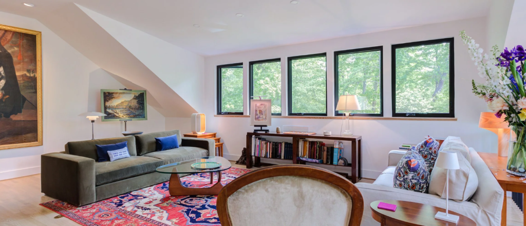 A former garage was transformed into a light-filled office and private gallery for a collector with a deep appreciation for art and history. A new structural gable window anchors the space, bringing in controlled daylight while framing the surrounding canopy. Clean architectural lines provide a quiet backdrop for paintings and artifacts, allowing the collection to take center stage. The result is both workplace and sanctuary, contemporary in form yet deeply personal in expression.