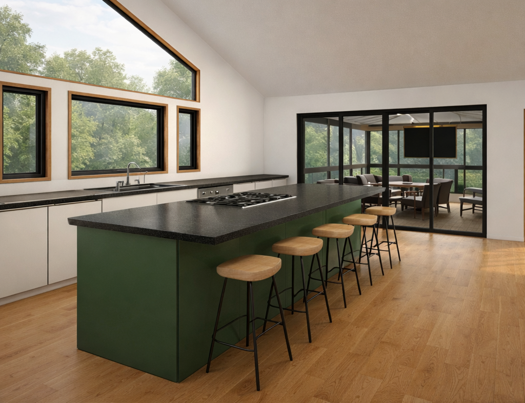 A thoughtful renovation of a 1980s home, expanded to support a quieter rural retirement. Two additions frame the existing structure: a screened porch, primary suite, and yoga & art studio extending from one side, and a small light filled library anchoring the other. Together they create a series of retreat spaces connected to the surrounding landscape.